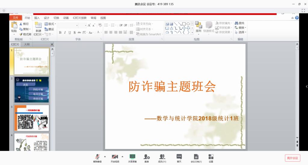 本站讯 2020年3月25日下午四点半,山东大学(威海)taptap点点体育2018级统计一班于线上举办防疫期间第六次线上主题班会,本次线上班会为防诈骗主题班会,旨在提醒班级同学要警惕诈骗,注意人身财产安全。本次班会由团支书秦千主持,统计一班全体成员参加。