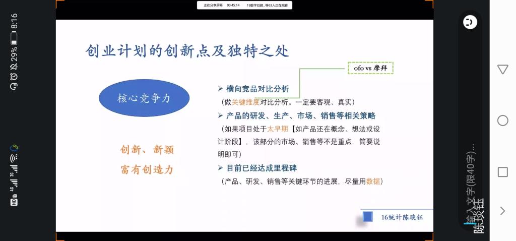 班会前期,宗玉暄同学将本次班会内容及所需查阅的知识点提前告知同学们。班会伊始,科研班主任陈琰钰为同学们播放了关于挑战杯和创青春的视频,使同学们初步了解挑战杯和创青春。视频结束后科研班主任陈琰钰针对当前社会的一些“痛点”和国家政策等进行详细的讲解。接下来对项目的注意点进行分析,首先是社会可行性,通过列举例子来生动说明项目与社会现状接轨的重要性;然后分析最重要一点——技术可行性。科研班主任陈琰钰又通过对作品的简介要求和项目有关的专利和授权情况、相同项目的发展情况概述和竞争问题以及项目的创新点这几个方面为同学们讲解相关知识。之后又讲述了策划书的写法及注意事项、产品与技术、市场分析、企业与管理、营销策略、投资分析、风险分析、专利这些方面,对同学们现有的疑惑进行解读,鼓励同学们积极表现自己,锻炼自己。宗玉暄同学讲解了常用科研统计图并针对基础知识、发展史、常见图汇总进行阐述,期间列举直方图、箱线图、条形图等函数,更加直观清晰,班会结束。