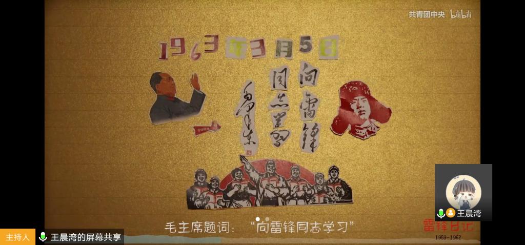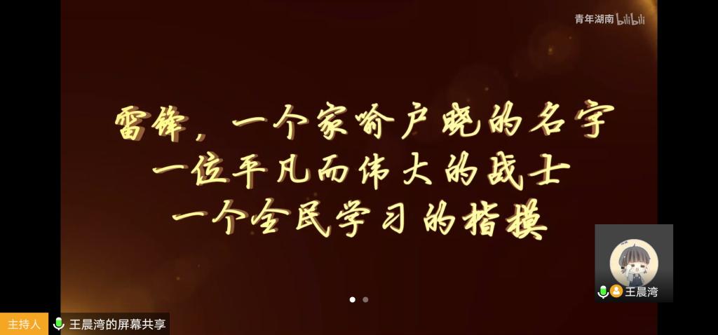 在如今3月份学雷锋月,活动通过全体同学线上共同观看弘扬雷锋精神的纪录片或视频开展,来培养同学们乐于助人的良好品质、为民服务的远大志向、向雷锋学习的可贵精神。此次活动共观看了五个弘扬雷锋精神的视频。第一个视频讲述了雷锋精神的实质——什么是雷锋精神?雷锋精神的核心是为人民服务,精神的内涵为奉献、“钉子”精神、“螺丝钉”精神、艰苦奋斗。第二个视频通过聚焦五个特殊人物及其群体,表达了如今社会对雷锋精神的传承——外卖员体现的新时代雷锋精神:爱岗敬业,忠于职守;竹艺师体现的新时代雷锋精神:刻苦钻研,勇于创新;帮助老人的市民体现的新时代雷锋精神:助人为乐,乐于奉献;创业者体现的新时代雷锋精神:艰苦奋斗,努力拼搏;少先队员体现的新时代雷锋精神:热爱祖国,热爱党。第三个视频点明了如今的社会需要雷锋精神,雷锋是万千解放军中的一员,但他在他力所能及的范围内做了长达一生的善举。第四、五个视频是中央电视台抗击疫情的演讲节目,在这个特殊的时期顺应时代潮流,“雷锋精神”在抗疫一线闪光。广大医务人员、警察、社区工作者一直坚守在战疫前线,“雷锋精神”始终闪耀着。新时代的“雷锋”们,前赴后继奔赴战场,合力筑牢了抵御疫情的堡垒。