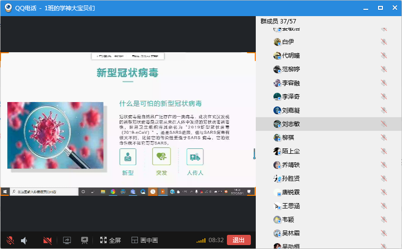 班会伊始,团支书陈姿言组织大家进入语音线上直播,并阐明了此次线上班会的主题。首先,组织委员秦美凤开始就PPT和大家一起进行疫情知识的学习,学习内容分为两个方面:对于新型冠状病毒肺炎的认识以及针对网上谣言进行了破谣,希望大家疫情期间能够科学防控,不信谣、不传谣。团支书陈姿言结合主题向大家提议“找些事情做”,介绍了一些疫情期间可行的学习方法和学习内容,并提出应该做好“学习+”活动,对之前同学们的进行的“学习+运动”活动持着赞同态度。最后,王祎璠进行了此次线上班会的总结,并对大家关心的开学时间、返校问题、成绩问题进行了一一解答,并提倡同学们在疫情期间做好科学防护的同时合理规划时间。