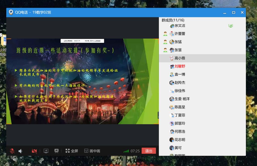 班会伊始,学习委员赵羚杰对同学们的到勤情况进行检查后,班委对同学们进行了疫情时期的鼓励与慰问,班长张猛说明会议目的以及举办线上会议的需要。心理委员缪凌宇结合PPT和大家一起进行疫情知识的学习,学习内容分为两个方面:对于新型冠状病毒肺炎的认识,与对于现状我们能够给予的支持,基本内容包括新型肺炎的定义、流行病学的调查、患者的症状和相应的保护措施等。学习结束后,班委呼吁大家好好利用假期,不荒废时光,并提出几条可行性方法;也呼吁大家要坚信祖国和祖国人民,服从各个地区的安排,积极配合,同舟共济。会议的最后,进行互动环节,大家自由发表对祖国的祝福等,并且有惊喜的彩蛋环节——向大家征询更多精彩的不同形式的班级线上活动,并提出几条可行性建议。