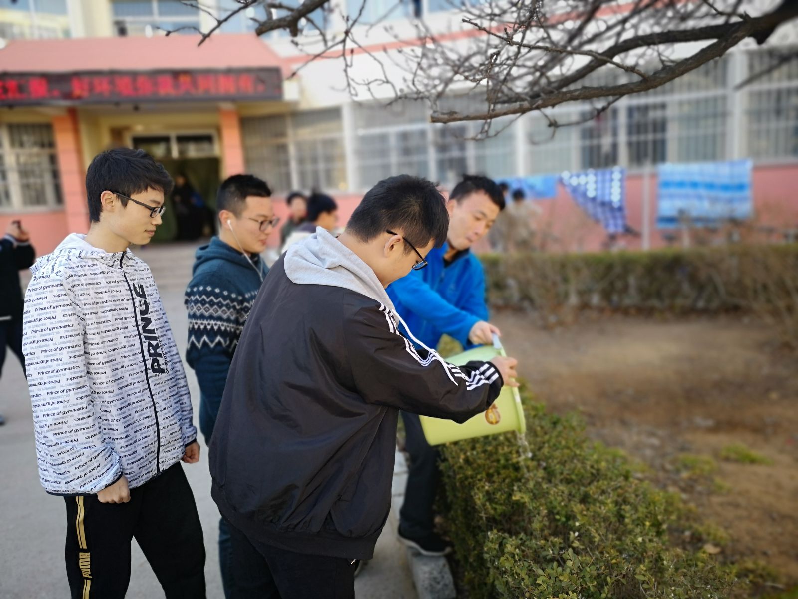 活动中,班级里报名参加的人于当天下午两点时按时在宿舍楼下集合,并以宿舍为单位,每个宿舍拿两个以上的浇水工具,有大号矿泉水瓶,水盆,水桶等工具。每个宿舍自己寻找一片浇水区域,对自己所负责的浇水区域分批次进行浇水,宿舍每个人轮流进宿舍楼内接水,每次对自己所负责区域内的树浇一遍后,等十分钟,树木把水全部吸收后,再次进行浇水。在活动的最后,每个宿舍展示自己的浇水成果,并进行拍照留念。同学们纷纷表示,通过参加本次浇灌志愿服务活动,理解了环卫工人工作的不易,贴近了大自然,感受到春天的气息。