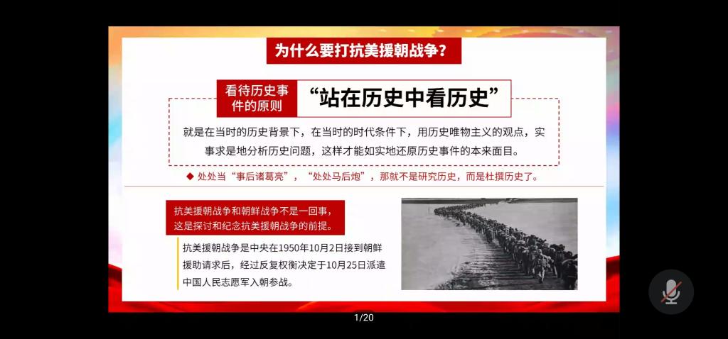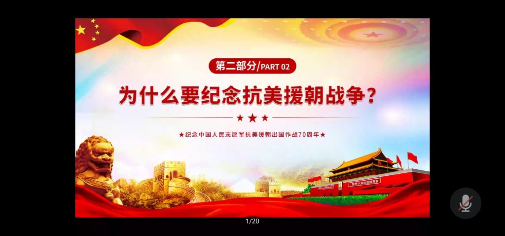 伟大的抗美援朝战争,是保卫和平、反抗侵略的正义之战,打出了新中国的国威和人民军队军威,创造了以弱胜强的范例,弘扬和光大了中国共产党和人民军队的革命精神。在“纪念中国人民志愿军抗美援朝出国作战70周年”的主题中,团支书张弘扬通过讲解“为什么要打抗美援朝战争”、“为什么要纪念抗美援朝战争”、“抗美援朝战争留下了什么”三部分,开展了此次10月主题团日活动。