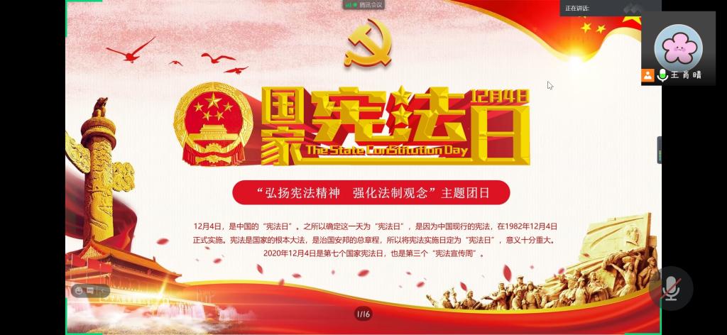 本站讯 12月6日上午10:00,2019信计团支部于腾讯会议举办“弘扬宪法精神,强化法制观念”主题团日活动。此次会议由团支书王肖晴主持,共48名团员参加了此次活动。