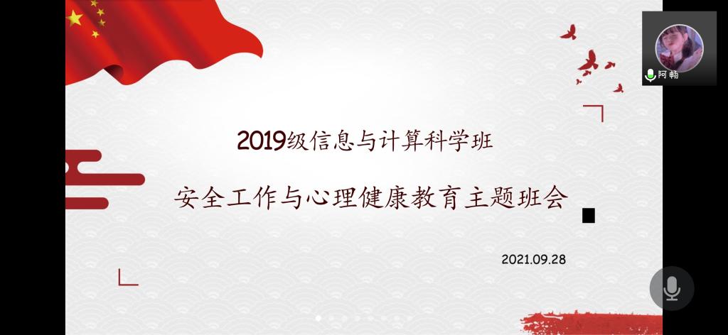 本站讯 2021年9月28日下午四点半,taptap点点体育2019级信息与计算科学班于腾讯会议举办“安全工作与心理健康教育”主题班会。本次班会由2019级辅导员王祎璠主持,共58人参加。