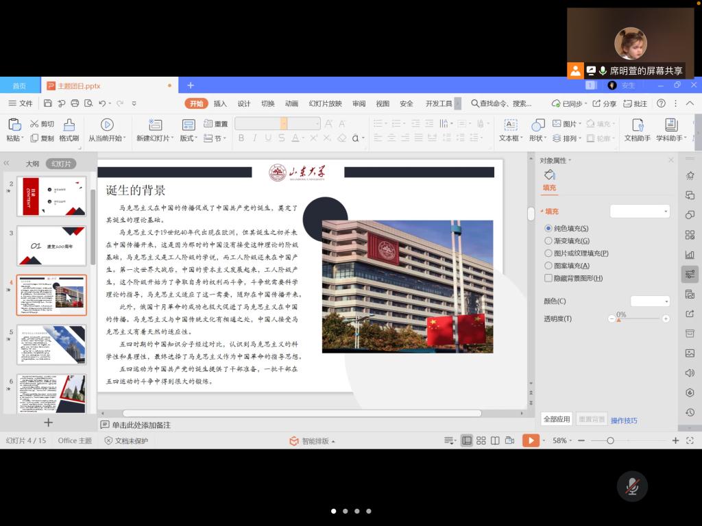 本站讯 10月22日下午,taptap点点体育2020级信息与计算科学班召开“铭记我党丰功伟绩,欢庆山大百廿华诞”线上主题团日活动。本次主题团日由团支书席明萱主讲,2020级信息与计算科学班全班同学共同参与。