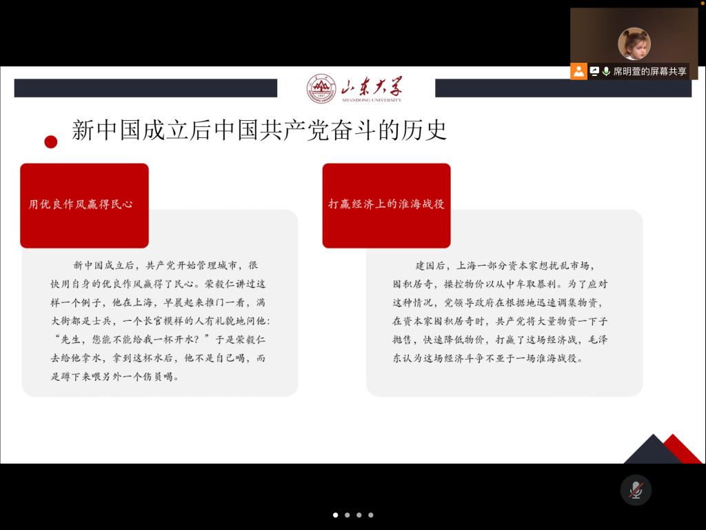 活动就庆祝建党一百周年、建校一百二十周年两个方面展开。活动伊始,席明萱讲述了中国共产党一百年来的艰辛历程,介绍了中国共产党诞生的背景、经历失败后领导新民主主义革命取得的胜利。在新中国成立后中国共产党继续艰苦奋斗,用优良作风赢得民心、打赢经济上的“淮海战役”,解放思想,实事求是,团结一致向前看,在自身建设中不断创新理论。党的十八大以后,中国特色社会主义进入新时代,各项实力走上新台阶。而后,围绕建校一百二十周年,回顾了山东大学校长樊丽明在山东大学一百二十周年校庆典礼的致辞讲话,展示了山东大学的辉煌成果、独特的“山大基因”、浓厚的学术氛围与深厚的历史底蕴。山东大学始终坚守初心、引领创新,扎根中国、厚植齐鲁,奋力建设担当中华民族复兴大任的世界一流大学。席明萱表示,作为山大学子,定要继承发扬山大精神,传承山大家国情怀,做有正气、有锐气、有勇气、有底气的新时代青年。