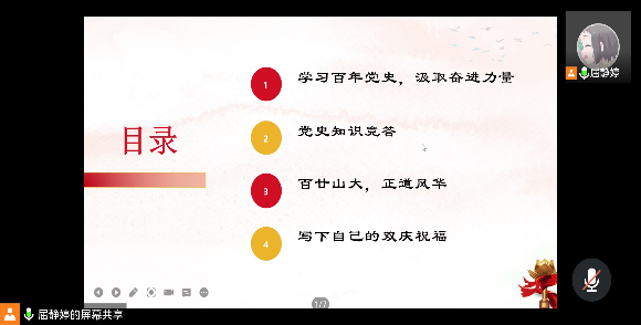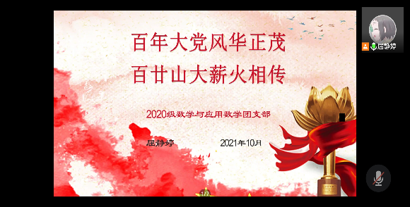 本站讯 10月22日下午,taptap点点体育2020级数学班开展“百年大党风华正茂,百廿山大薪火相传”线上主题团日活动。本次活动由2020级数学班团支书屈静婷主持,2020级数学班全体团员参与。