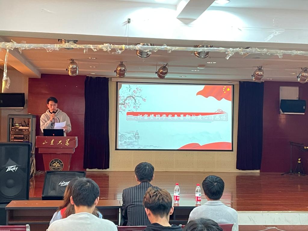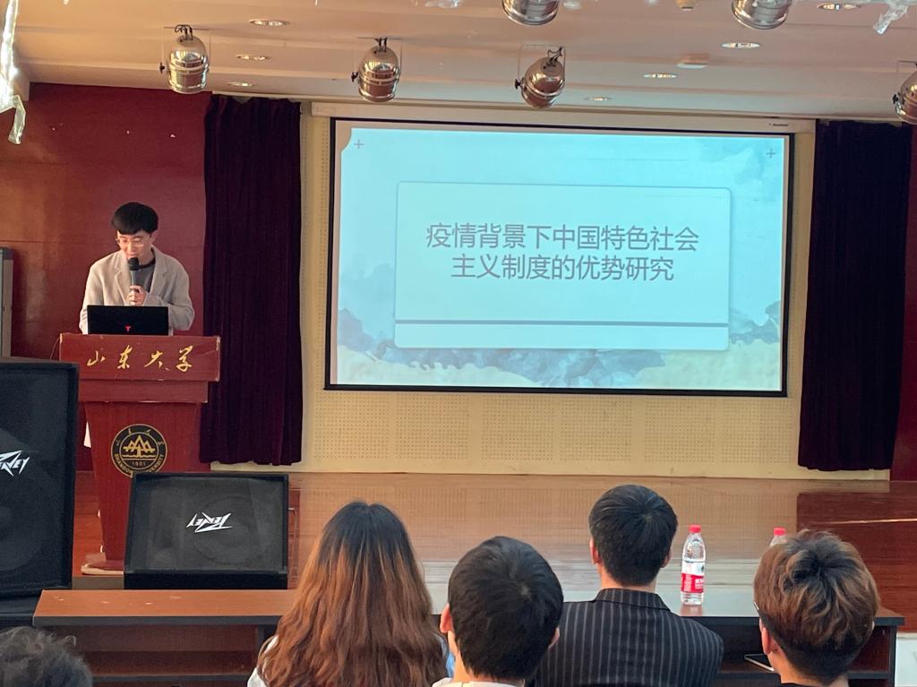 活动伊始,侯潇涵介绍了本次活动的主要内容与流程:疫情中看中国特色社会主义讲座;祁富赟抗疫心得感悟;统计系教工党支部书记杨丰凯以及辅导员魏佳佳讲话。接着,申泽睿就《疫情中看中国特色社会主义》为同学们详细地讲解了疫情背景下中国特色社会主义的优势。突如其来的新冠肺炎疫情让每一位中华儿女进一步感受到实现中国特色社会主义共同理想的底气和信心,也让大家看到了党的集中统一领导制度优势。随后,祁富赟讲述其在暑假期间志愿投身于疫情防控心得感悟。在他身上,同学们看到了青年人应有的家国情怀和勇于承担社会责任的良好品质,充分展现了新时代中国青年的精神风貌。活动最后,杨丰凯和魏佳佳针对此次活动主题做了深刻发言,鼓励同学们要严格要求自己,练就过硬本领,提升个人综合素质和品德能力,把自己塑造成德智体美劳全面发展的优秀人才,为实现中华民族伟大复兴贡献出自己的力量。