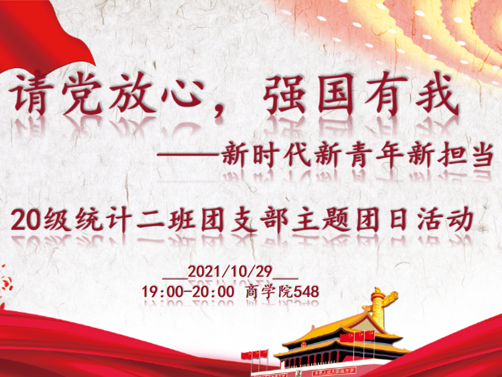 至此,2020级统计二班“请党放心,强国有我”主题团日活动顺利结束。本次活动通过回顾习近平总书记“七一”重要讲话精神、党的百年历程,激发了全体同学强烈的爱国之情,强调了青年学子的历史责任和历史使命,有助于后续主题团日活动的进行。