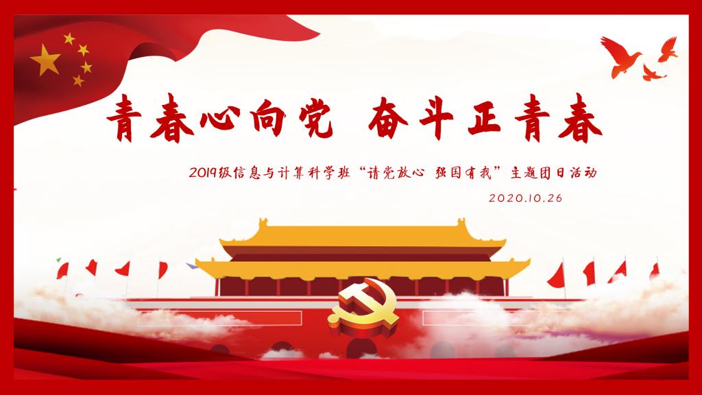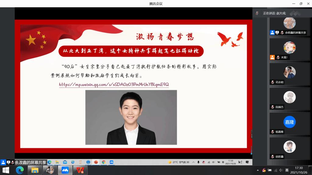 本站讯 2021年10月26日下午16:30,taptap点点体育2019级信息与计算科学班于腾讯会议举办“青春心向党 奋斗正青春——请党放心 强国有我”主题团日活动。本次活动由信息与计算科学班团支书王肖晴发起,团支部委员共同筹备组织,由团支书王肖晴、班长赵大成和组织委员赵新宇共同主持,团支部共53人参加,辅导员王祎璠列席参加。