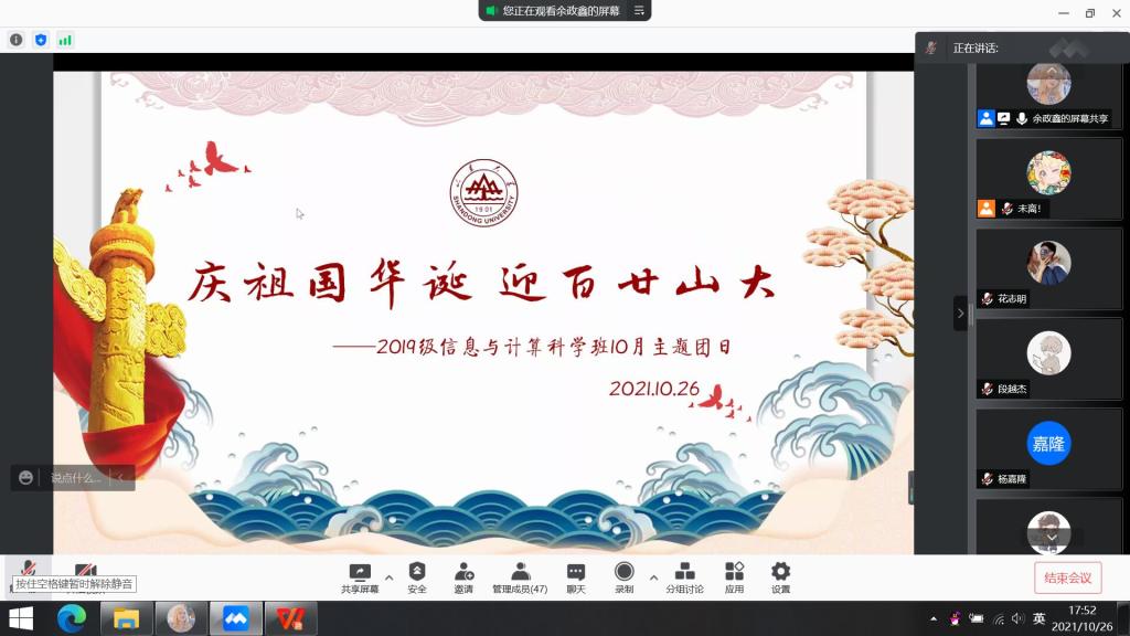 本站讯 2021年10月26日下午18:40,taptap点点体育2019级信息与计算科学班于腾讯会议举办“庆祖国华诞 迎百廿山大”10月主题团日活动。本次活动由信息与计算科学班团支书王肖晴发起,宣传委员余政鑫和文体委员何雨霖共同筹备组织,宣传委员余政鑫主持,团支部共53人参加。