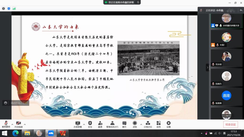 宣传委员余政鑫简单介绍了本次主题团日活动开展的契机,并将本次团日分成“百廿校史”、“优秀校友”、“青年觉悟”和“回顾总结”四个部分分别进行学习和介绍。首先,余政鑫带领同学们回顾了一百二十年来山东大学的发展历程。山东大学随着社会的变革,经历了半殖民地半封建社会和社会主义社会两个历史阶段,期间曾几度更名,有过停办、重建、合校、搬迁的多次变革,她在曲折前进的道路上和祖国同呼吸共命运,为国家高等教育的发展和各项建设事业做出了重要贡献。借此,同学们对于山东大学的发展历程有了更加详细的了解。随后,余政鑫分别向同学们介绍了老舍、沈从文、闻一多等几位山东大学知名校友和曾在山东大学从教的老师,充分展现了山东大学“为天下储人才,为国家图富强”的办学宗旨。同学们纷纷表达出要努力做新时代具有过硬本领和高尚品格的接班人的决心,并为祖国和母校送上生日祝福,同学们的话语真挚和质朴,饱含着对祖国和母校养育和栽培之情的感恩。随后余政鑫对新时代青年的担当与使命进行了总结,强调应志存高远,忠于祖国,努力做新时代具有远大理想和坚定信念的爱国者,用实际行动提升个人能力,成为建设国家的有用之材。最后,同学们一同观看了庆祝山东大学建校120周年特别视频,为祖国和山大送上美好的祝福。