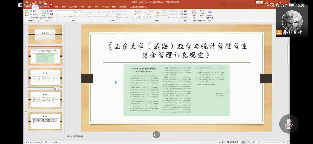 杨智捷首先强调了召开此次班会的背景——由于最近宿舍违规使用电器事件频繁发生,为保护同学们的生命财产安全,营造整洁文明的宿舍环境,特召开此次主题班会。在简单说明原因后,杨智捷向大家介绍了《山东大学(威海)taptap点点体育学生宿舍管理补充规定》,并对前三条进行重点说明。此外,他强调在学生推优入党以及各类评奖评优中,宿舍表现作为学生日常表现要求之一将作为重要参考依据,并提醒同学们辅导员将定期与不合格宿舍成员谈话,进行提醒及口头教育。随后,王肖晴进行补充,并针对“我为青年做件事”问题征集活动、青年大学习完成积极性以及“庆祝建党百年 展现青春担当”升国旗主题团日活动三个事情进行了简单说明及动员。
