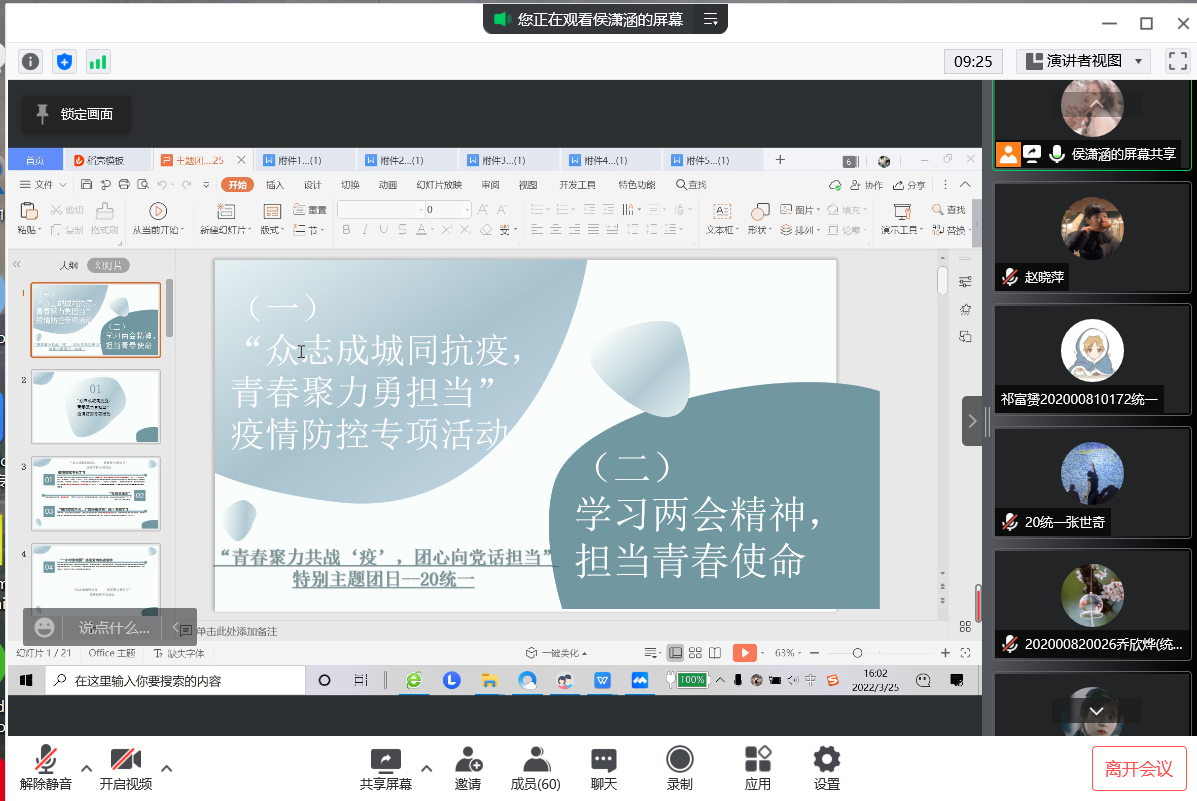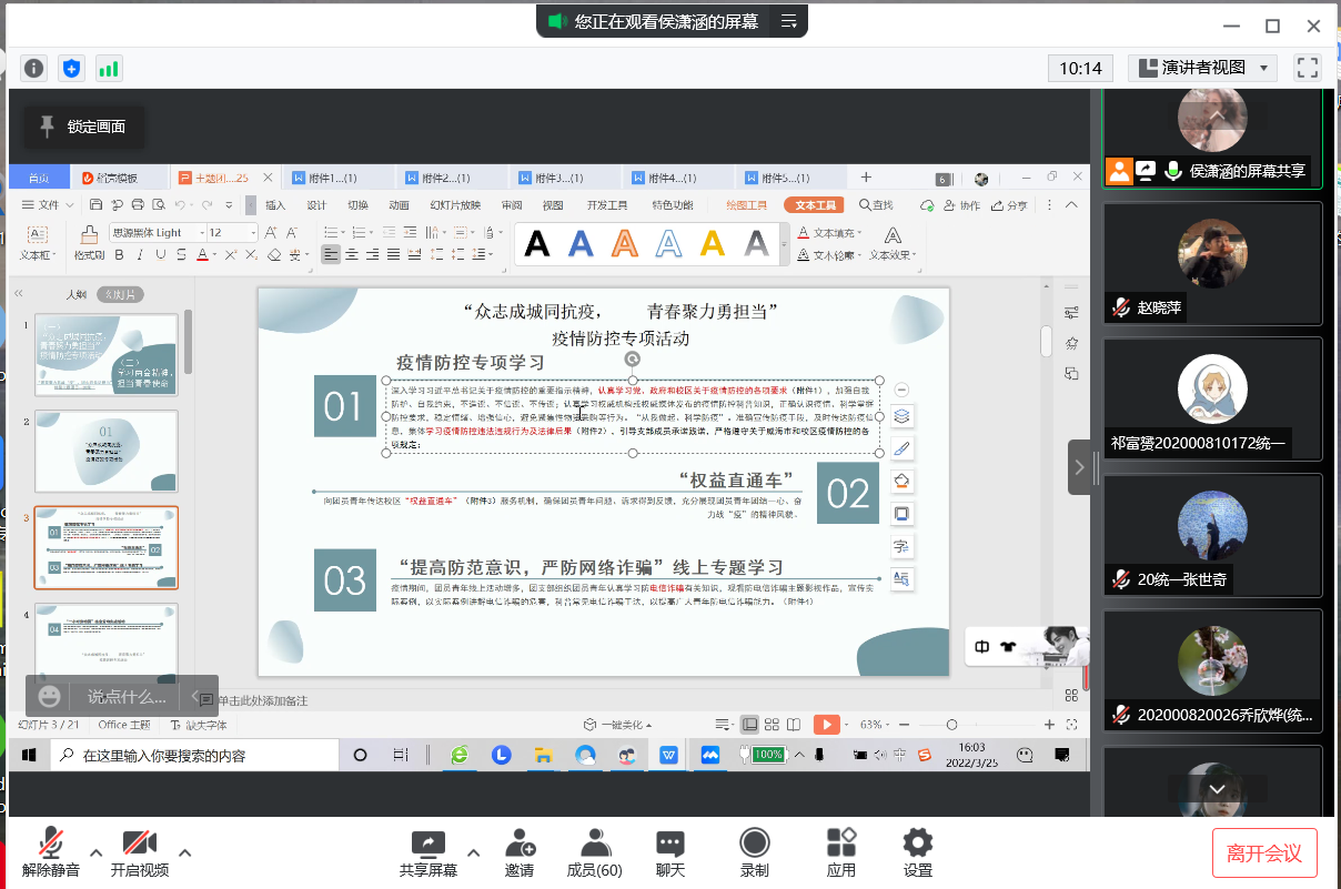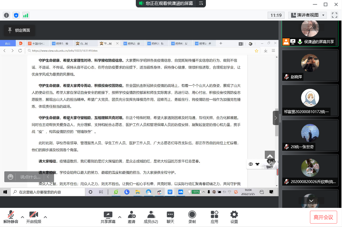 本站讯 3月25日下午,2020级统计一班开展“青春聚力共战‘疫’,团心向党话担当”特别主题团日。此次主题团日由团支书侯潇涵主持,全班67名团员参加。近日新冠病毒突袭威海,疫情防控形势异常严峻,为贯彻校区要求,引领凝聚团员青年落实威海市和校区各项疫情防控措施,本次主题团日活动以“青春聚力共战‘疫’,团心向党话担当”为主题,意在带领同学们学习疫情防控线上专题学习教育和提高同学们防疫意识。
