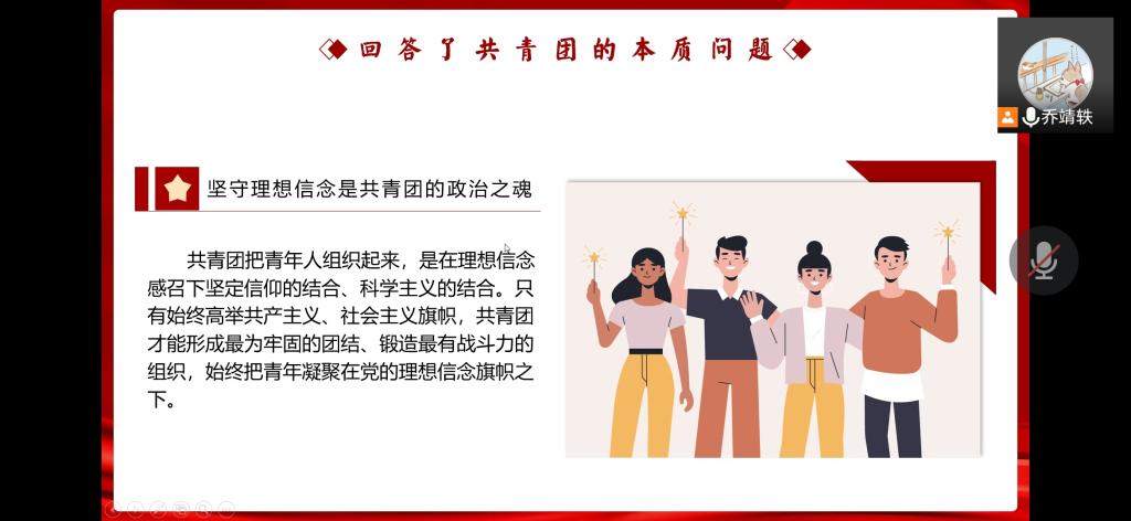 会议伊始,乔靖轶点明本次主题团日旨在学习习近平总书记在庆祝中国共产主义青年团成立100周年大会上的重要讲话精神,接着带领同学们将讲话分为三个部分进行学习。第一部分,习总书记高度评价了共青团成立100周年的辉煌历史,肯定了百年来共青团组织履行党的助手和后备军作用、团员青年发挥民族复兴先锋作用。第二部分,习总书记回答了共青团“是什么、该干什么”等本质问题,指出坚守理想信念是共青团的政治之魂,投身民族复兴是共青团的奋进之魂,扎根广大青年是共青团的活力之源。第三部分,习总书记深刻回答了“新时代建设什么样的共青团、怎样建设共青团”这一大问题,对新时代共青团、新时代共青团员和团干部都做出了行为与道德规范。乔靖轶强调同学们应严格遵守新时代共青团员的要求,成为理想远大、政治坚,定刻苦学习、锐意创新,敢于斗争、善于斗争,崇德向善、严守纪律的新时代新青年。集体学习后,王祎璠在总结中表示,希望广大团员能够进一步学习习近平总书记的重要讲话精神,以此为指引,激励自己自觉担当尽责,勇做新时代的弄潮儿,自觉听从党和人民召唤,到新时代新天地中去施展抱负、建功立业,争当伟大理想的追梦人,争做伟大事业的生力军,让青春在祖国和人民最需要的地方绽放绚丽之花!